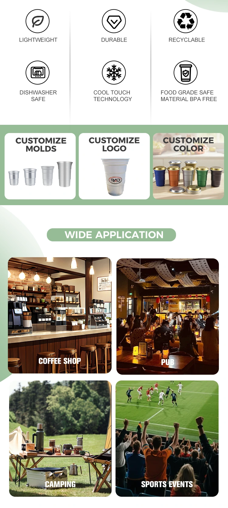 Outdoor leisure scenes: It is an ideal choice for portable drink containers in outdoor activities such as camping, picnics, and barbecue parties. It is lightweight and does not take up space, is strong and not easy to break, and can be easily stored and recycled after drinking, without polluting the natural environment. At large outdoor activities such as sports events and music festivals, when used in large quantities, its lightweight design can reduce transportation energy consumption, and the complete recycling link can realize resource recycling, helping to create a "zero-carbon event" scenario.