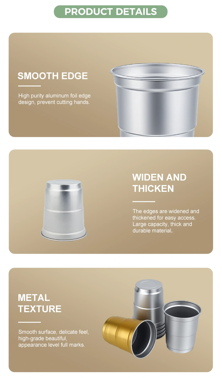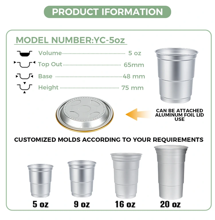 Yunchu aluminum foil supplier's 5oz disposable recyclable cold drink aluminum beverage cup, with a simple and elegant aluminum metal texture, makes this beverage cup suitable for a wide range of scenarios, covering multiple fields such as commercial operations, leisure gatherings, large-scale events, etc., becoming the preferred solution for scenario-based packaging: