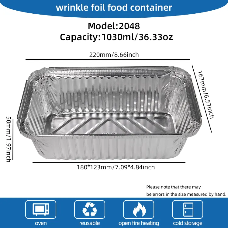 Yunchu Aluminum Foil Factory's disposable barbecue baking lunch box silver aluminum foil container is made of high-purity food-grade aluminum foil. It is non-toxic and tasteless, resistant to high temperature and low temperature. The melting point is as high as 250°C. It can be in direct contact with food. It does not release harmful substances when heated at high temperatures. It can also maintain stable shape when refrigerated and frozen. It is a one-time design and can be thrown away after use. No need to spend time cleaning plates and baking pans, completely detoxifying It solves the tedious problem of cleaning after meals, and is especially suitable for scenes such as gatherings with many people and outdoor travel. The upgraded thickened aluminum foil material has a solid texture and strong supporting capacity. It is not easy to leak or deform when holding dishes with soups or heavy barbecue ingredients. The edges are smooth and burr-free, making it safer to use. It is also suitable for ovens, air fryers, steamers and other kitchen utensils, and cooking and serving can be done in one step.