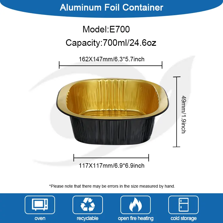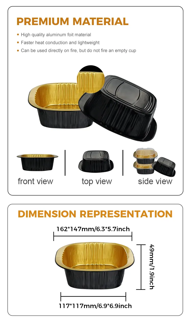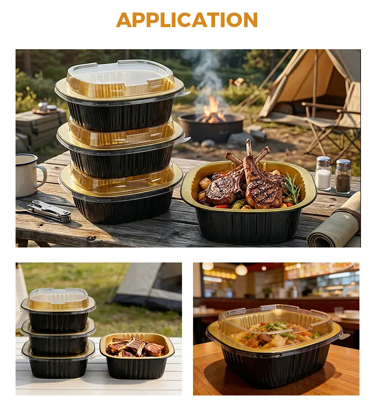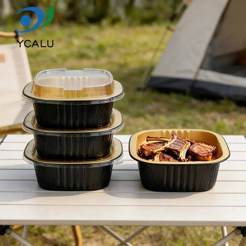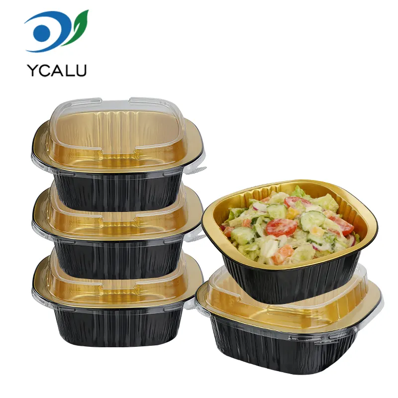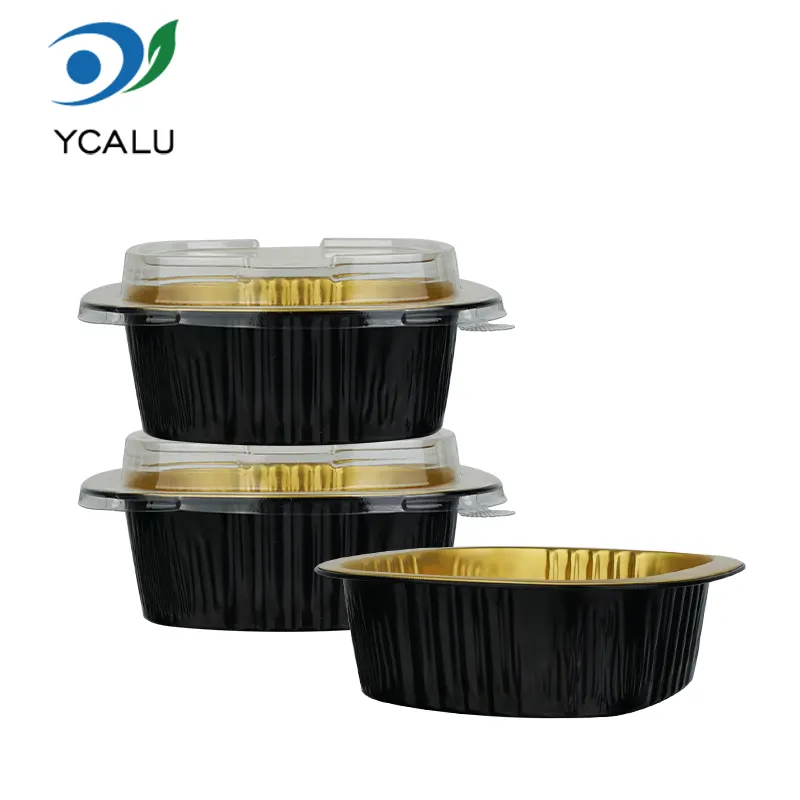 ​Yunchu Aluminum Foil Supplier's disposable binaural square box black gold light-walled aluminum foil containers are made of food-grade 8011 aluminum alloy foil. They have been treated with high-temperature annealing and sterilization processes to form a dense oxide layer on the surface. They have no heavy metals and no odor. They can be in direct contact with all types of food and prevent the precipitation of harmful substances at high temperatures. Whether they are used to hold hot dishes, cold dishes, desserts or sauces, they can protect food safety and comply with multiple safety certifications such as FDA and SGS, making every bite more secure. The unique black gold light wall design breaks the monotonous texture of traditional aluminum foil containers. The matte black gold coating and smooth wall surface bring a high-end sense. Not only does it have an outstanding appearance, it can also effectively block light and oxygen, delay the oxidation of food, firmly lock in the aroma and moisture of food, avoid odor transfer, and keep the original taste of food for a long time. The smooth wall surface has no grooves or wrinkles, making it less likely to breed bacteria and is easy to clean. It can also better adapt to printing customization, helping catering brands to enhance their recognition and quality.