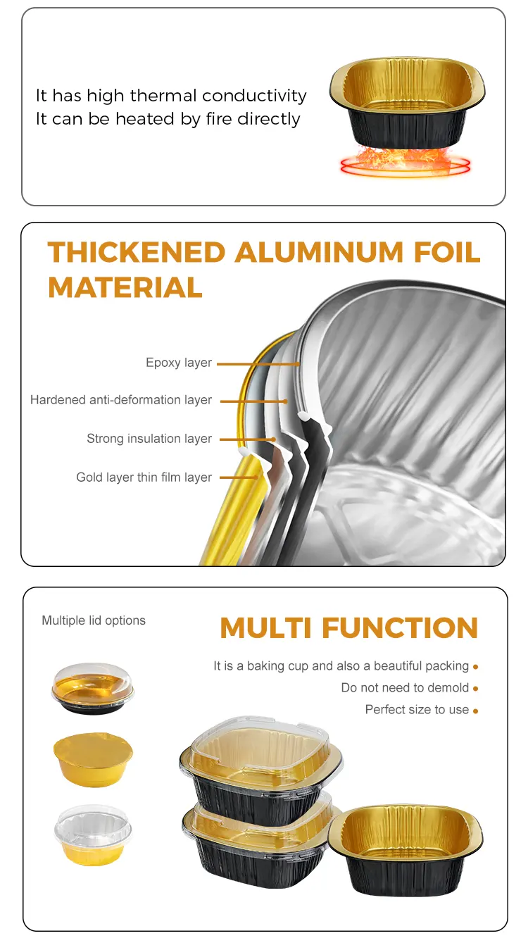 Yunchu Aluminum Foil Supplier's disposable double-ear square box black gold light-walled aluminum foil container has a square shape design, full space utilization, rounded and smooth corners, no sharp burrs, and safer to use; thoughtful double-ear design, ergonomic, insulated and anti-scalding, easy to take, even if it contains hot meals and soups, it can be easily held to avoid hand burns and solve the inconvenient pain point of traditional aluminum foil boxes. Made of thickened aluminum foil, it has a solid and tough texture, strong supporting capacity, and is not easily deformed or damaged. It can hold food with soups and fats without leakage or side leakage problems, and its durability is far superior to ordinary disposable lunch boxes.