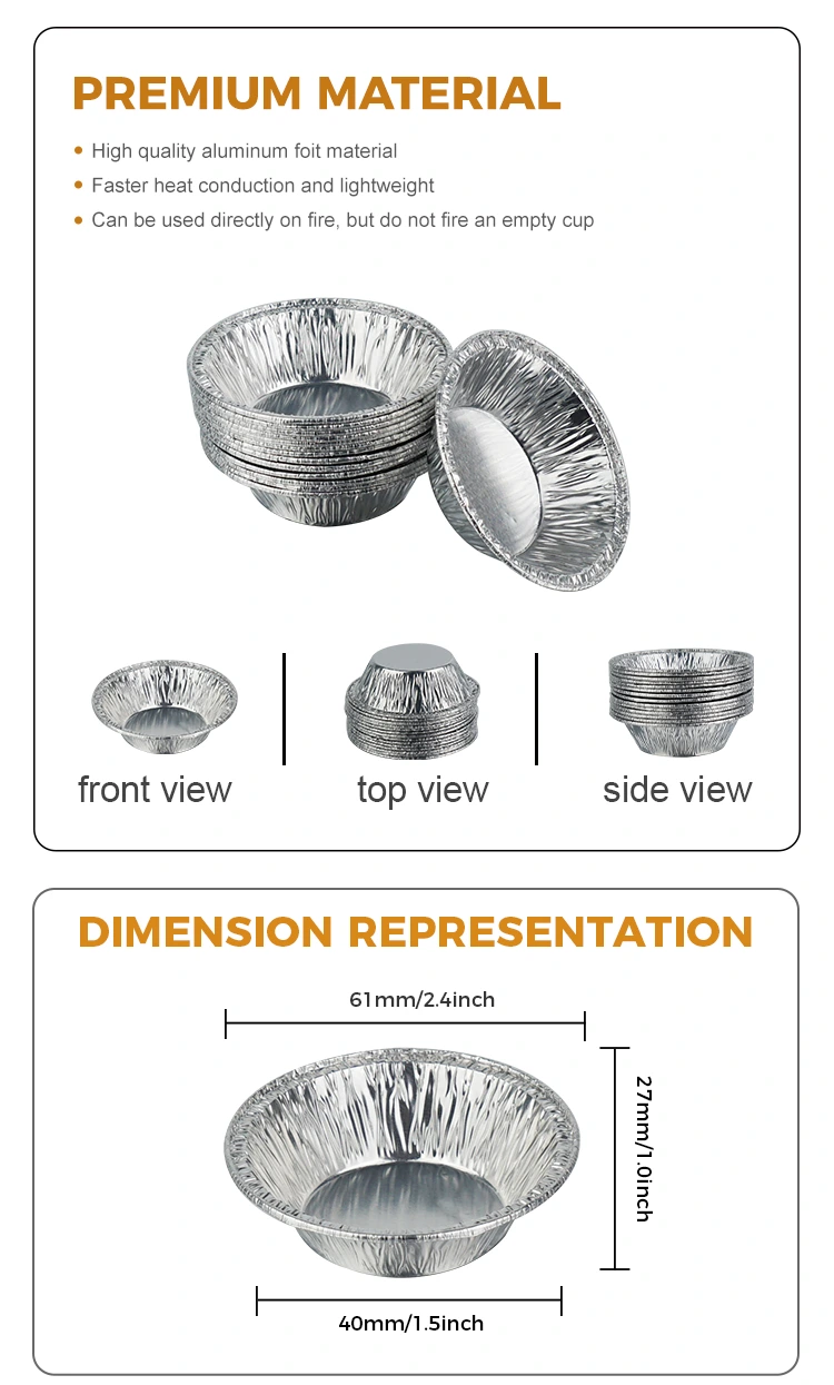 Yunchu aluminum foil disposable egg tart tray silver aluminum foil container is made of food-grade thickened aluminum foil and has passed multiple safety tests. It has no odor and no harmful residues, making direct contact with food more secure.The unique thickened design gives the product excellent support and excellent high-temperature resistance. Whether it is baked at high temperatures in the oven or precisely heated in the air fryer, it is not easily deformed or leaks, ensuring that the egg tarts are completely set and the edges are crispy and will not collapse.At the same time, the aluminum foil material conducts heat evenly, allowing the egg tarts to be heated more evenly, avoiding burnt outside and raw inside, and easily baking professional-grade egg tarts that are golden on the outside and tender on the inside.