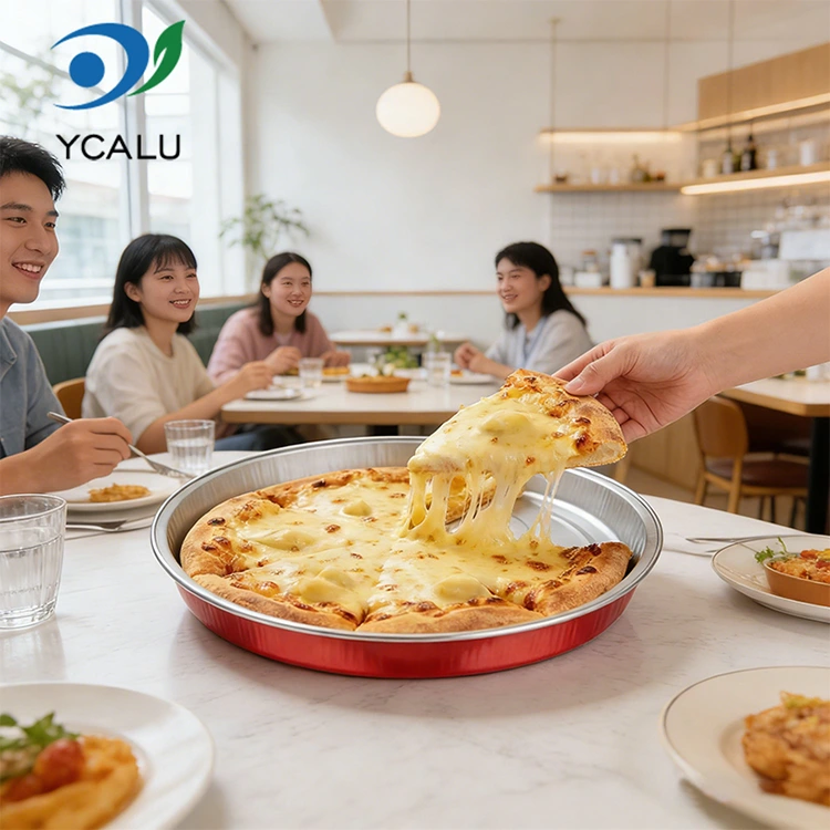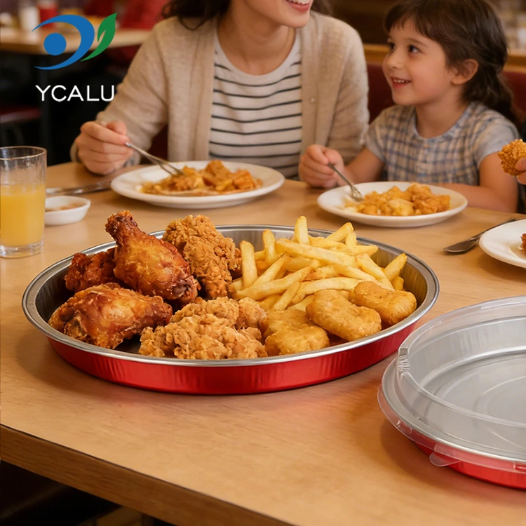 Yunchu Aluminum Foil Supplier C900 Disposable Pizza Pan Packaging Round Aluminum Foil Container is made of food-grade raw aluminum foil, with no odor and impurities, making it safe to touch food with confidence. The thickness is uniform and solid, and it can withstand high temperatures up to 250°C and low temperatures down to -20°C. Freshly hot pizza can be served directly. It can be refrigerated and kept fresh without changing the container. It can be eaten directly by heating, which greatly improves the efficiency of food delivery and saves the trouble of cleaning. The aluminum foil PET cover effectively blocks the intrusion of water vapor and air and prevents grease leakage. The classic round arc accurately fits all types of pizza shapes, with multiple sizes available from 7 to 9 inches. It is perfectly suitable for different specifications such as handmade pizza, Italian pizza, and American thick crust. There is no extra space to prevent the pizza from sliding and toppings falling off. The one-piece molding process creates a stable shape, is resistant to pressure and collision, and is not easily deformed or damaged during transportation. It can also maintain its shape when stacked and stored, completely solving the pain point of easily damaged takeout packaging and ensuring that every pizza is delivered in good condition.