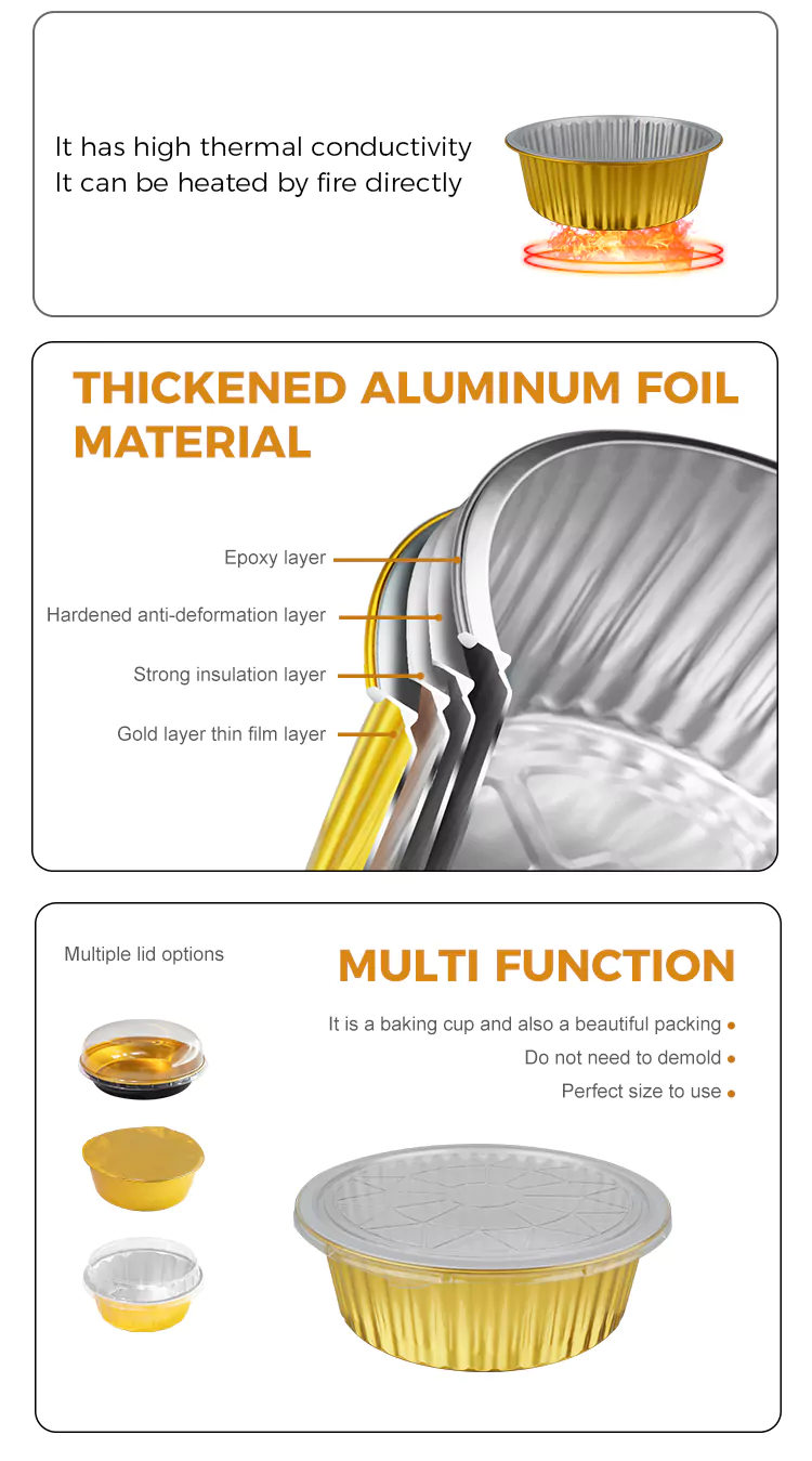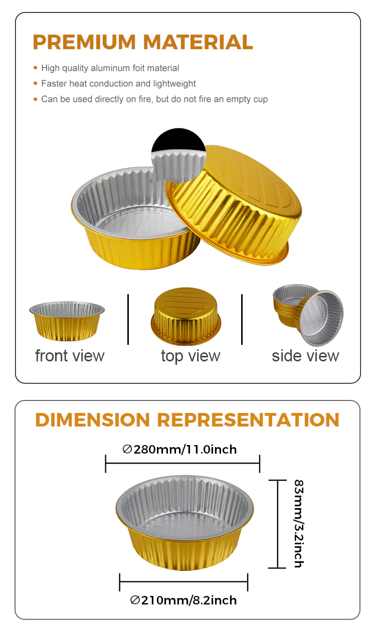 We focus on the strength design of Disposable round large capacity gold Aluminum Foil Containers. The wall thickness is scientifically proportioned to ensure both flexibility for easy shaping and sufficient load-bearing capacity. It is not prone to deformation or leakage when used to hold soups, dishes, baked goods, etc. The edges are treated with a rolled edge process, providing a smooth touch that does not scratch the hand, making it safer to use. We offer a variety of capacity specifications for your selection, ranging from mini dessert boxes to family sharing packs, catering to the needs of different scenarios. Whether it's for takeout in restaurants, finished product packaging in bakeries, or storing homemade delicacies at home, they can all be easily adapted.