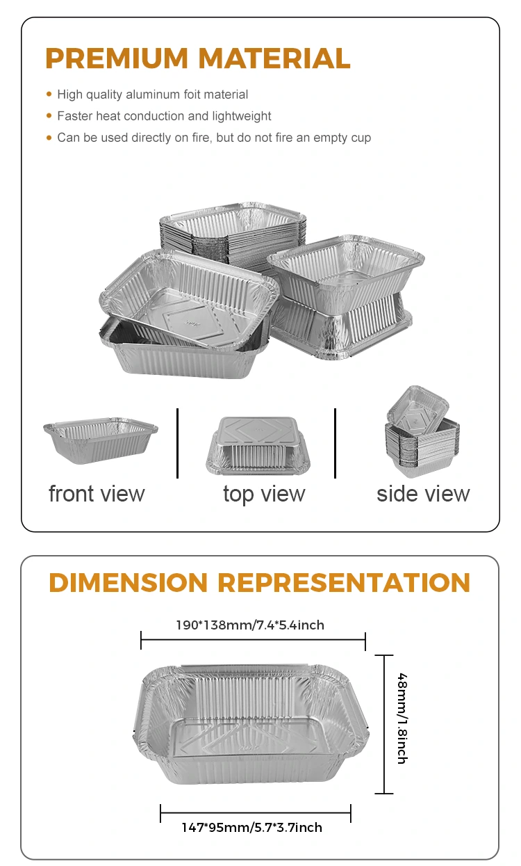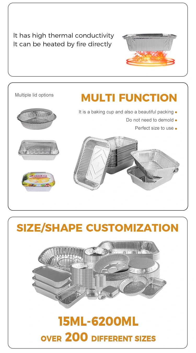 The aluminum foil lunch boxes we provide are made of 8011 aluminum foil material, which has excellent thermal insulation properties and can effectively maintain the temperature of food. In particular, our rectangular silver aluminum foil container for baking lunch boxes not only has heat preservation properties, but can also be used with an aluminum foil lid to facilitate personalized customization of the LOGO.