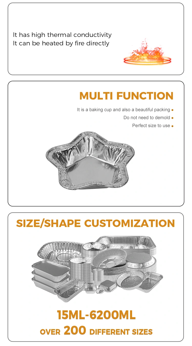 Yunchu Aluminum Foil Supplier Star-shaped aluminum foil tart cups for baking Aluminum Foil Food Container is a high-quality baking silver aluminum foil container. This product is practical and effectively solves problems when making tarts or small foods, such as washing pans and grease residue. The inner and outer walls of the bottom of the Star-shaped aluminum foil tart cups for baking Aluminum Foil Food Container are designed to be smooth, preventing sticking after baking and avoiding scorching at the bottom.